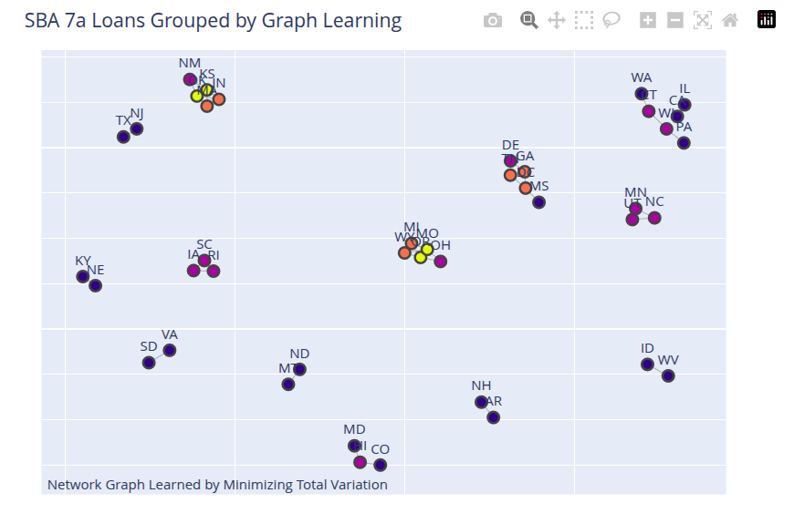 Thus, graph nodes are the geographical states (TX, VA, etc.) and we observe the CP100 attribute for each state. Can we learn a graph using the total_variation smoothing approach? I tried this and I think the results are good. States with similar charge-off values are grouped together. States with extreme values (high or low) are outliers and not connected to other states. This shows which states are candidates for IID analysis and which are not. Please note that this result is based on the regularization values I have used with this solution.