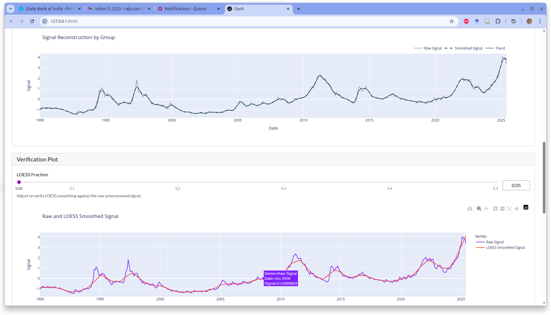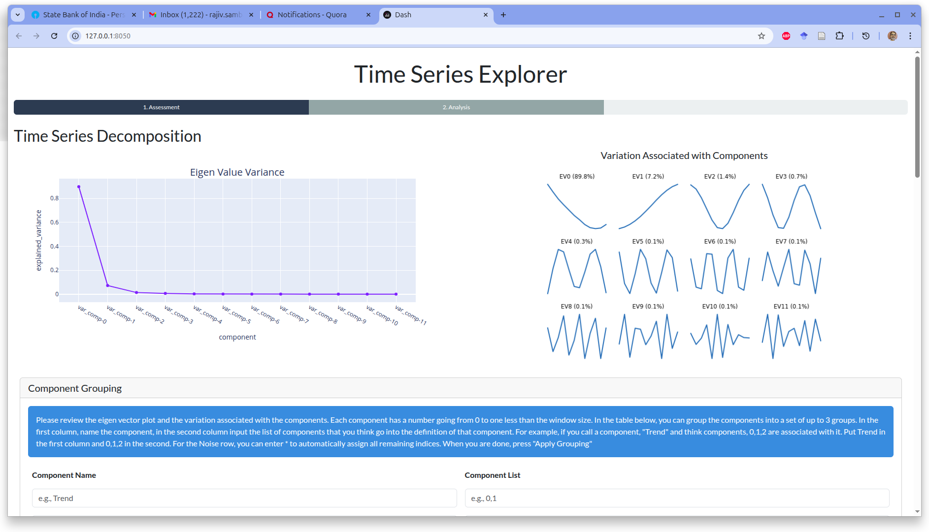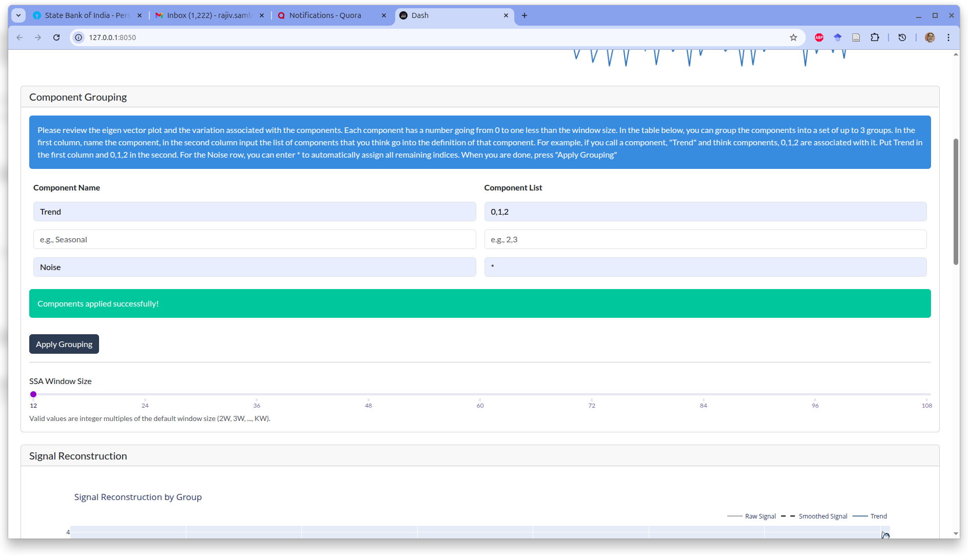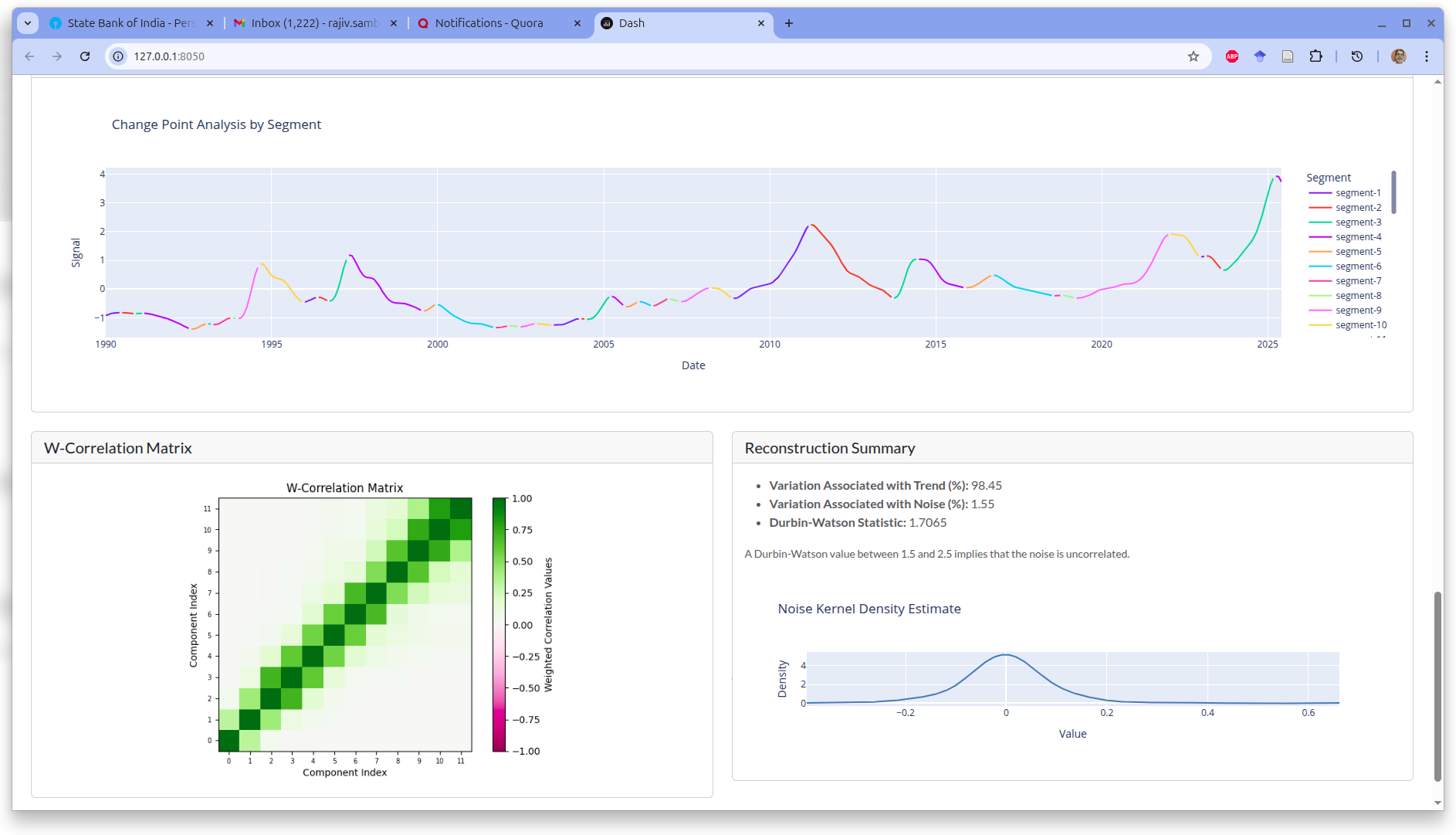 - A decomposition of the data using SSA is done for you. This is based on a heuristic window selection. This should be reasonable for most datasets, but you can change the window size and see how the decomposition changes. You then pick the grouping of components for the decomposition. You do this by looking initially at the ACF plot, the eigenvector plots, and the explained variance plot. You apply the grouping and assess the quality of the decomposition by looking at the reconstructed components and the residuals. You can also look at the weighted correlation matrix to see how the components are correlated with each other. The grouping is important because it determines how the data is decomposed and what structure is captured in the various components. In data with strong structure (e.g. strong seasonality, strong trend, etc.), you can use the derivative idea to see where the signal changes. This is additional information that you get with this tool. If your data has weak structure (for example, if you upload white noise), this tool will indicate that it is not a good fit for your data.