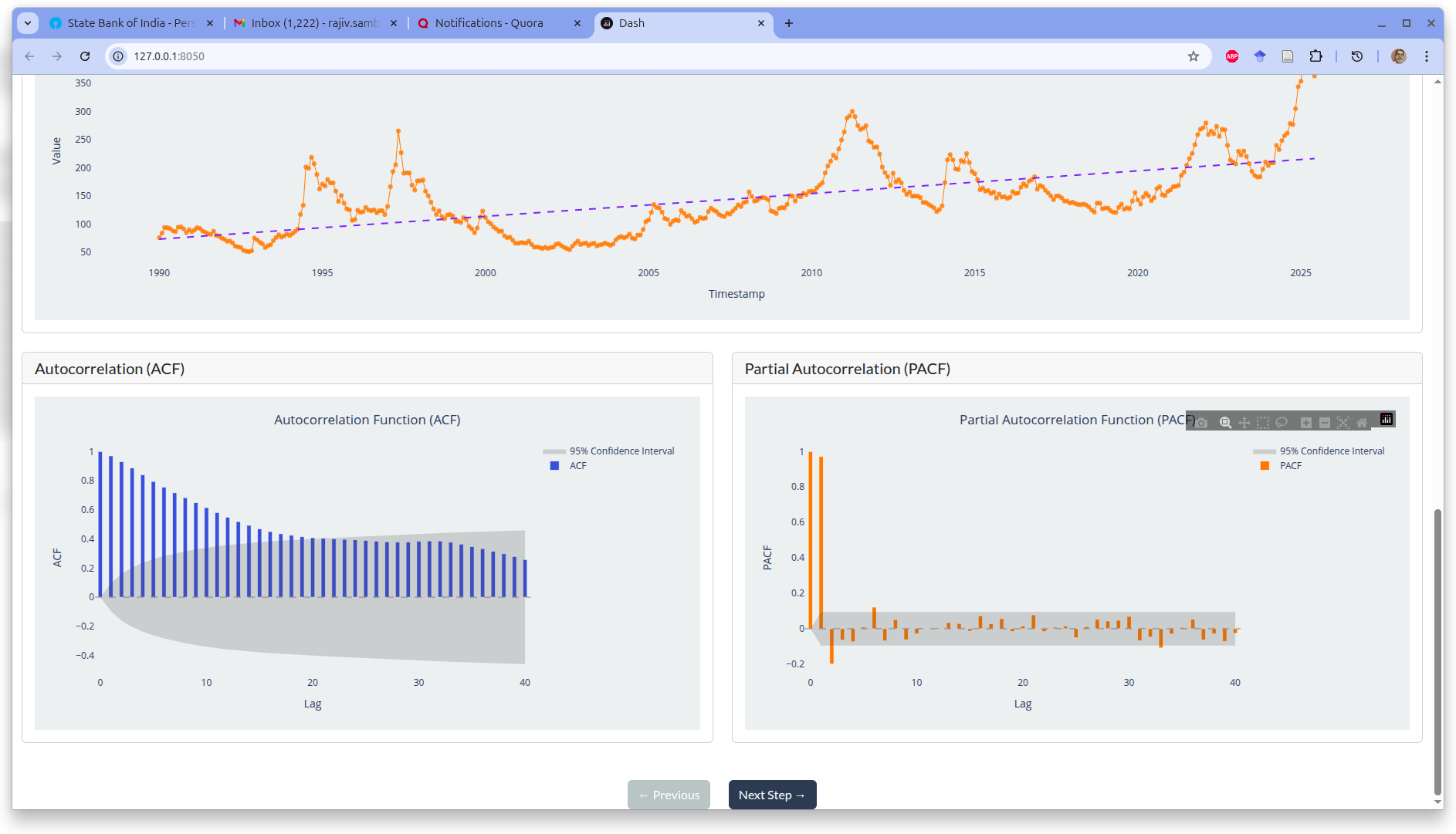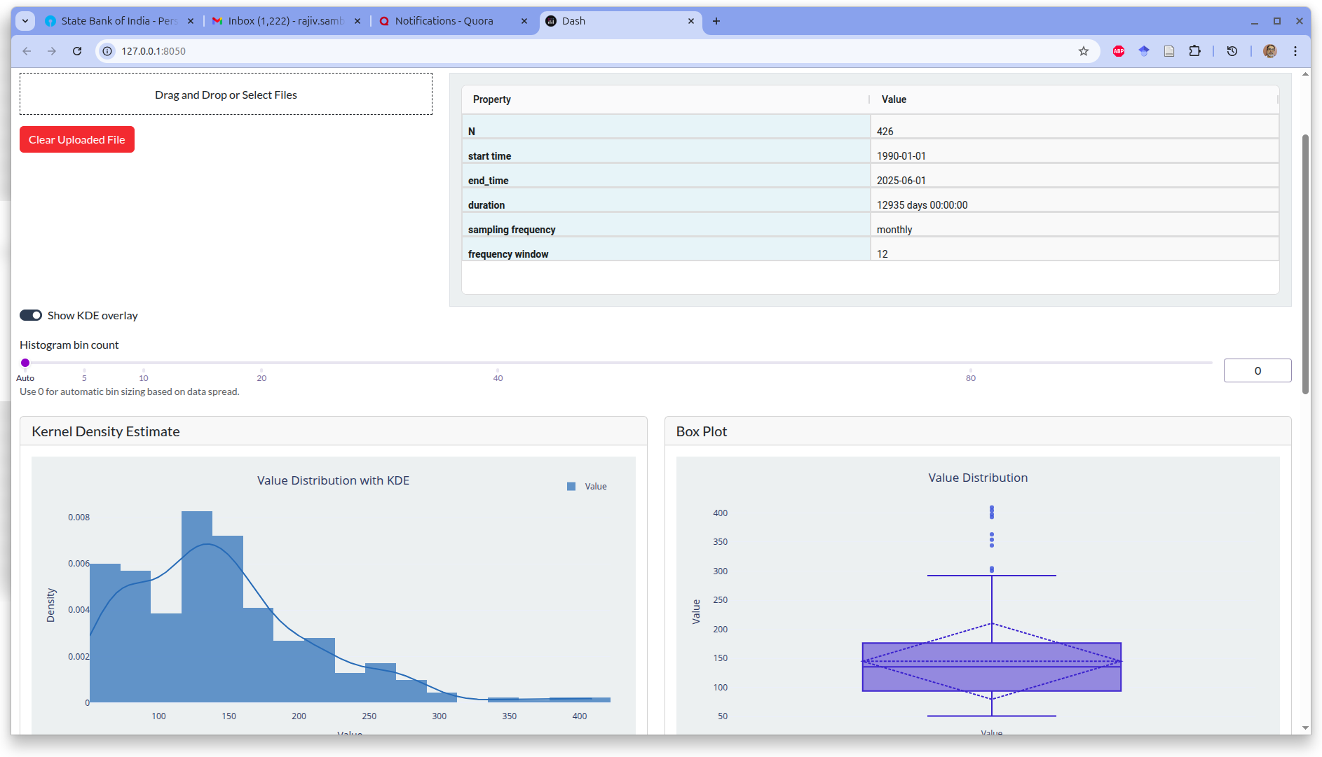 - Upload your data (CSV) file. The data should be in long format, with a timestamp column and a value column. You get an initial assessment of the data and its structure through the following: