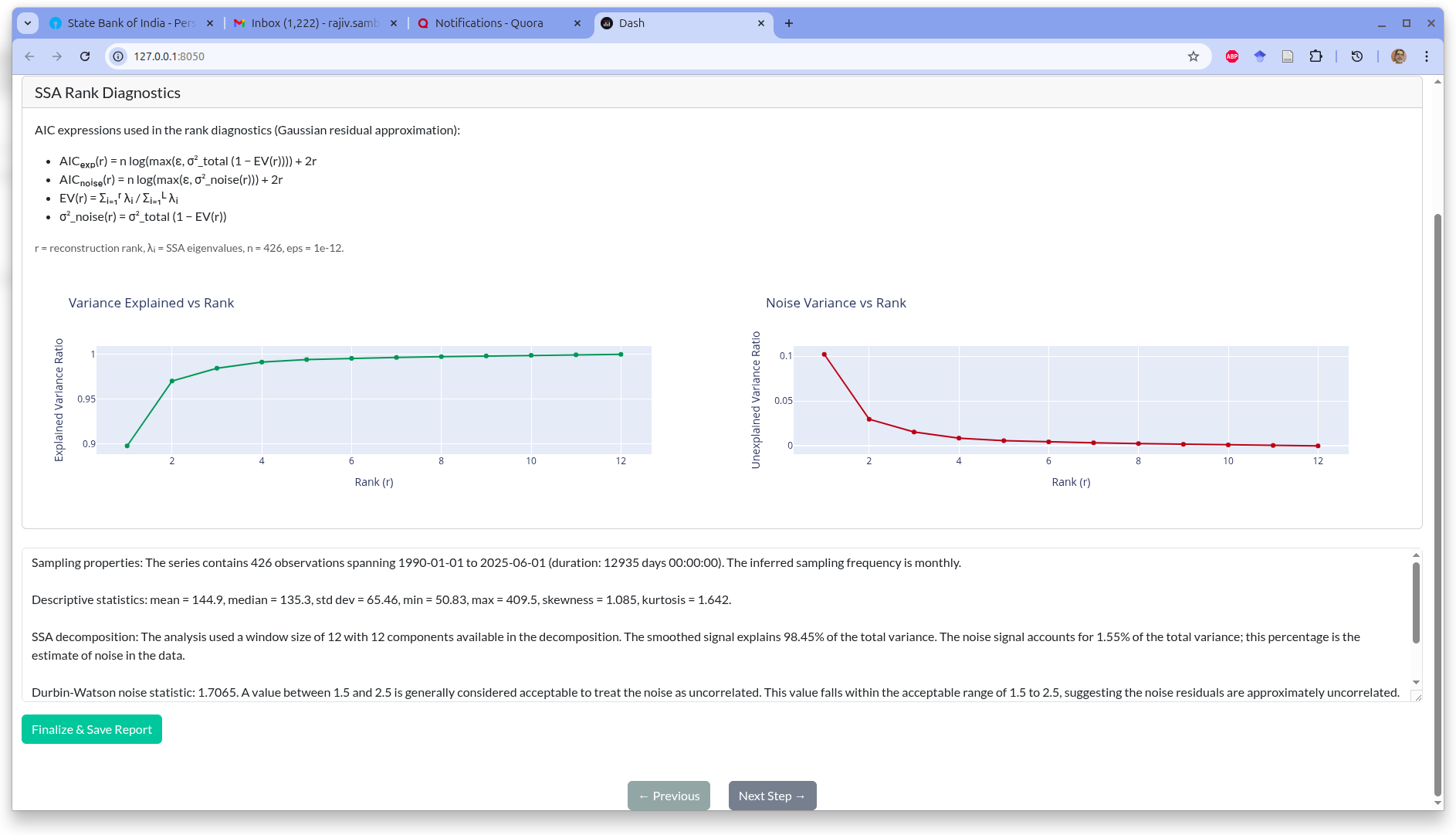 - An AIC-based model selection report is done for you. Recall that SSA is based on an eigen-decomposition of the trajectory matrix. The eigenvalues of the trajectory matrix can be used to determine the number of components to keep for the decomposition. The AIC-based model selection report shows explained variance and noise as a function of model rank. An automatic summary of all the plots and the report is generated for you. You can then correlate this with your monitoring, modeling, and control objectives, add or change anything you want, and save the report for future reference.